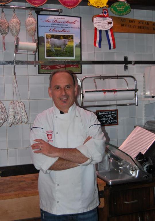 Chez les Dugelay, on est boucher de père en fils, depuis quatre générations. Le père de Didier Dugelay était installé, rue des Rancy, non loin, de la rue Paul Bert. Didier a repris une bonne Maison, en face de la salle Rameau, depuis une douzaine d’années. Mais, pourquoi vous parler de Didier Dugelay ? Parce qu’il vend de la très bonne viande ? Bien entendu… Mais, encore ? Parce que tout simplement, il est le fournisseur de la divine Arlette Hugon qui fait incontestablement, la meilleure blanquette de Lyon, et de ses environs. Pour faire une bonne blanquette, aurait volontiers chanté le regretté Fernandel, il faut un sérieux tour de main, et, connaître la recette, unique et secrète. Mais hélas, ceci ne suffit pas !... Il faut aussi l’essentiel, la viande de veau élevée sous la mère, de préférence. Là, Didier Dugelay est un véritable expert. Les bêtes qu’il fait élever figurent dans les concours. Elles remportèrent le 2e Prix du Festival du bœuf charolais en 2013, et le 1er Prix du Comice de Feurs, en 2014. Pour lui, le veau de haute qualité doit avoir une viande tout à la fois épaisse et claire. On dit dans le métier : un veau « blanche neige ». Arlette Hugon trouve chez Didier Dugelay ses morceaux de prédilection, toujours, et uniquement, dans le flanchet. Didier Dugelay recherche la vérité dans le produit. Traiteur, il prépare parfois des asperges, à manger sans sauce, pour apprécier leur goût naturel, un peu vert, et très légèrement marqué par le souvenir de leur passage en pleine terre. Boucherie Didier Dugelay-24,rue de la Martinière-Lyon 1er. 04 78 28 87 39