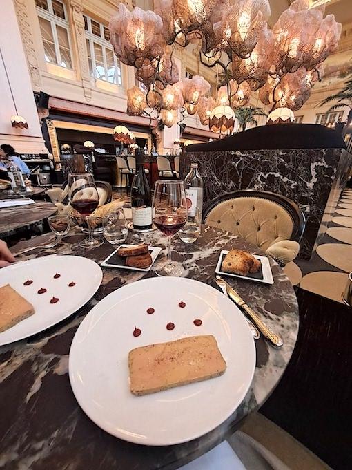 A part le menu déjeuner, la carte offre un grand choix : amuses-bouches, entrées, viandes, poissons, pâtes, accompagnements, fromages et desserts. Pour tous les goûts, pour tous les budgets. En ce jour d’automne, notre choix pencha pour le foie gras, goûteux, à température ambiante, bien assaisonné, servi avec des toasts chauds, suivi d’une côte de bœuf à partager, très bien cuite accompagnée de frites fraîches impeccables. Les assiettes sont préparées avec soin devant les convives selon la tradition du beau service en salle. Le vin, une Hautes Côtes de nuits 2022 "Louis Auguste", fut également servi avec un professionnalisme sans faute.